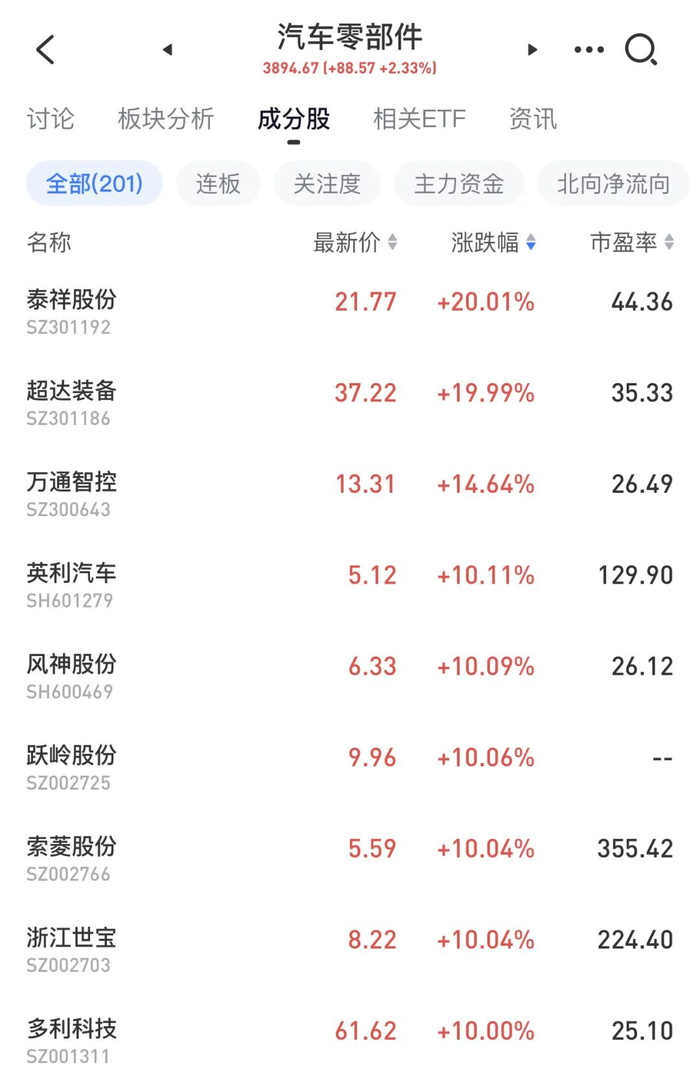 汽车零部件等新能源汽车产业链集体走强,江苏华辰涨停走出5天4板,泰祥股份、超达装备均20CM涨停,亚星客车、上海物贸、多利科技、浙江世宝、西上海、迪生力等多股涨停。