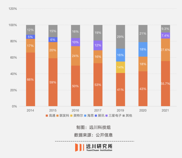 基带芯片是手机的核心零部件之一,在华为的芯片无法获得代工后,能够在主流市场站稳脚跟的几乎只有高通和联发科,在高端机型里,高通几乎处于垄断地位,这也为它带来了巨大的商业话语权。