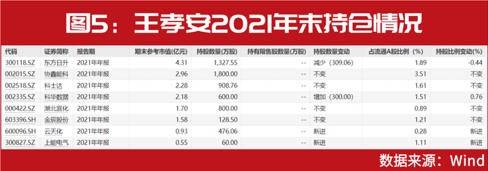 2021年,新能源概念强势崛起,王孝安再次成功转舵,科士达、协鑫能科、上能电气等牛股均曾一度被其收入囊中(见图5)。