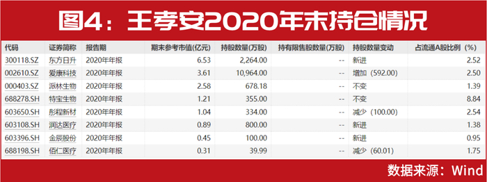 2020年,王孝安开始转战医药股,年末,王孝安现身于8家公司的前十大流通股东名单,4家来自医药领域(见图4)。
