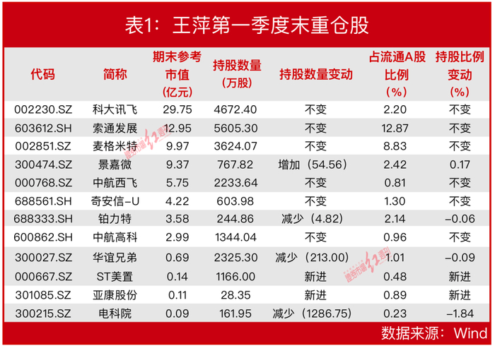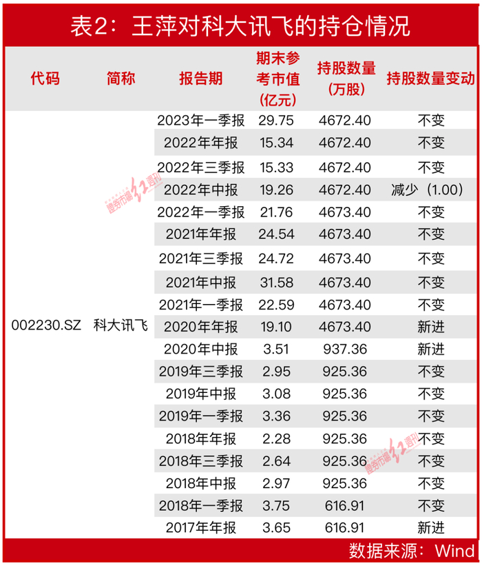 其第一大重仓股科大讯飞的历史大股东持仓名单中,王萍虽曾先后三次以新进姿态出现,但结合具体持股来看,其几次”消失”于前十大股东名单,不排除只是暂时被动退出的可能,而2020年四季度,随着王萍对科大讯飞大规模增仓,至今已连续10个报告期稳居公司第六大流通股股东(见表2)。