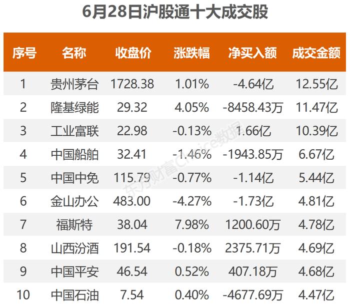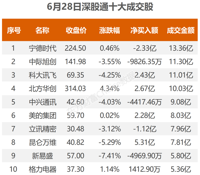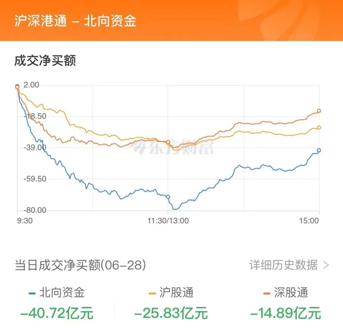 6月28日,两市探底回升,沪指相对偏强。北向资金当日净流出40.72亿元,其中沪股通净流出25.83亿元,深股通净流出14.89亿元。北向资金当日成交金额1166.13亿元,占A股总成交额的13.17%。