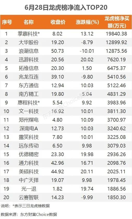 日内上榜龙虎榜个股中,资金净流入最多的是掌趣科技,三日净流入1.98亿元。数据显示,该股日内大涨13.12%,近三日累计涨幅为28.12%。资金净流入居前的深股通席位三日净买入5934.38万元。