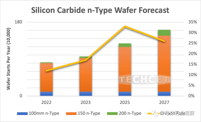 SiC晶圆方面,尽管今年全球经济和其他半导体材料市场普遍出现放缓,但SiC晶圆将持续强劲增长。据TECHCET发布了最新的碳化硅晶圆材料报告预计,SiC晶圆市场将在2023年进一步增长,达到107.2万片晶圆,同比增长约22%。2022-2027年的整体复合年增长率估计约为17%。