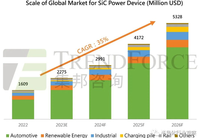 近年来,随着新能源汽车渗透率稳步抬升的同时,头部车企对于碳化硅功率半导体试水的速度、广度和深度不断推进,碳化硅上车的呼声越来越高。据TrendForce集邦咨询数据统计, 2023年整体SiC功率元件市场规模达22.8亿美元,年成长41.4%,预计2026年SiC功率元件市场规模可望达53.3亿美元,其中车用SiC功率元件市场规模将攀升至39.4亿美元。