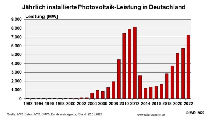 德国过去三十年历年光伏装机量,这里可更直观地看出其直至2022年也没有恢复到2010-2012年巅峰期的7.5-8GW。来源同上。