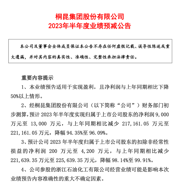 桐昆股份7月14日晚间公告称,预计2023年上半年归属于上市公司股东的净利润为0.9- 1.3亿元,同比下滑94.35%- 96.09%;扣非净利润200-4200万元,同比下滑98.14%-99.91%。
