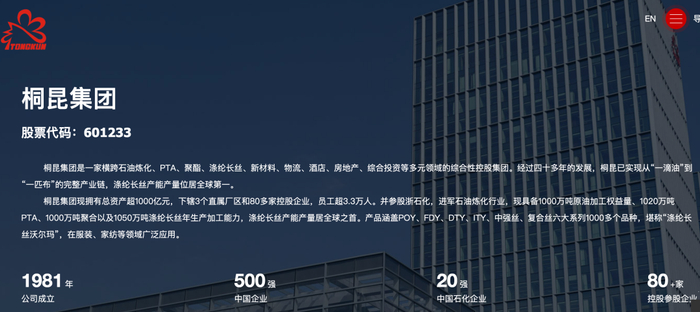 目前,桐昆控股集团总资产超1000亿元,下辖80多家控股企业,员工超3.3万人,涤纶长丝产量居全球之首。集团位列中国石油和化工企业500强第6位,浙商全国500强第29位。桐昆内部人士告诉记者,桐昆股份资产占桐昆控股集团总资产的90%。