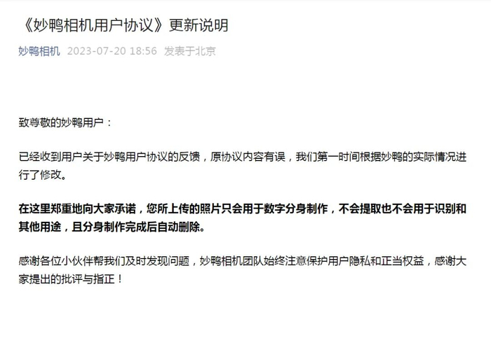 被质疑后,妙鸭相机于7月20日更新了部分条款,现用户协议更正为“您所上传的照片将仅用于本服务使用,我们仅提供图像处理服务,不会提取识别信息,不会用于识别用途,服务完成后,系统将自动删除上述信息,不予留存”。