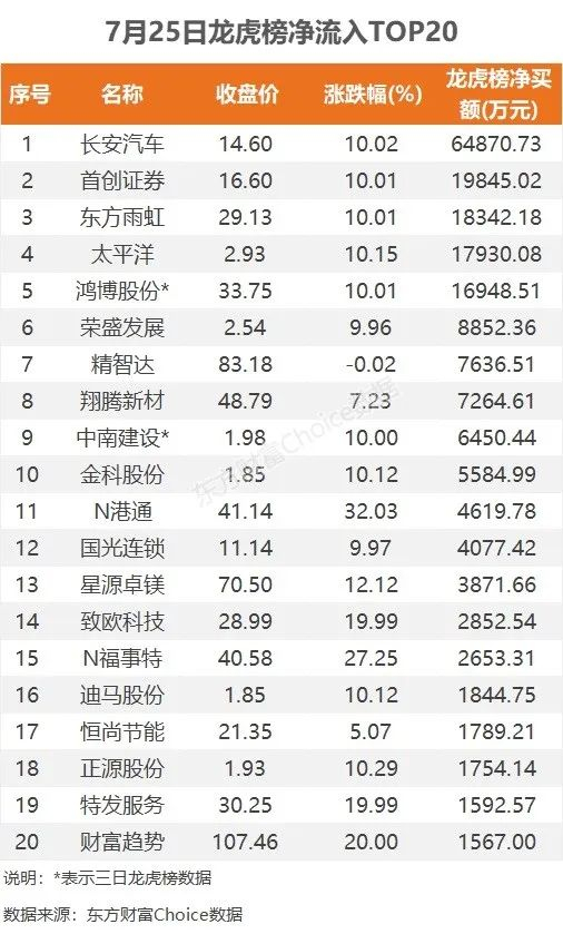 日内上榜龙虎榜个股中,资金净流入最多的是长安汽车,为6.49亿元。数据显示,该股日内涨停收盘,全天换手率为6.01%,成交额65.8亿元。资金净流入居前的深股通席位净买入4.82亿元,中金上海分公司净买入1.37亿元。