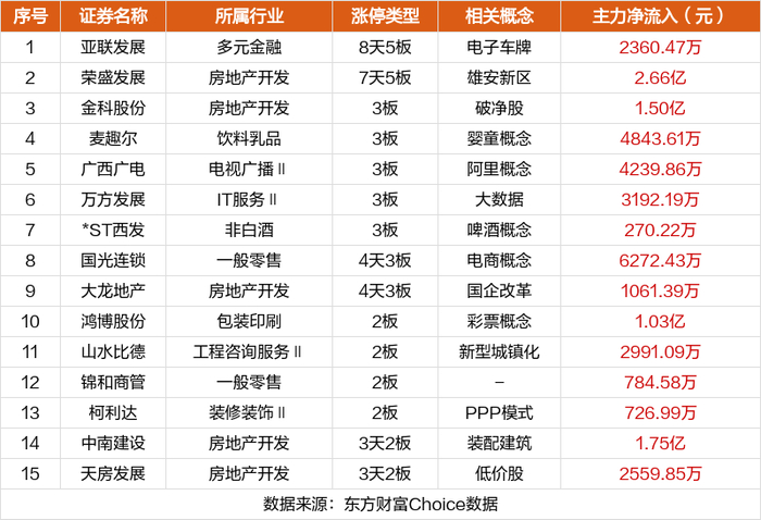 两市4413只个股上涨,716只个股下跌,涨停家数方面,今日合计有62股涨停,上个交易日27股涨停。其中,电子车牌亚联发展8天5板,雄安新区荣盛发展7天5板,破净股金科股份3板。
