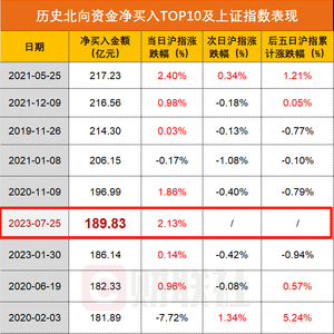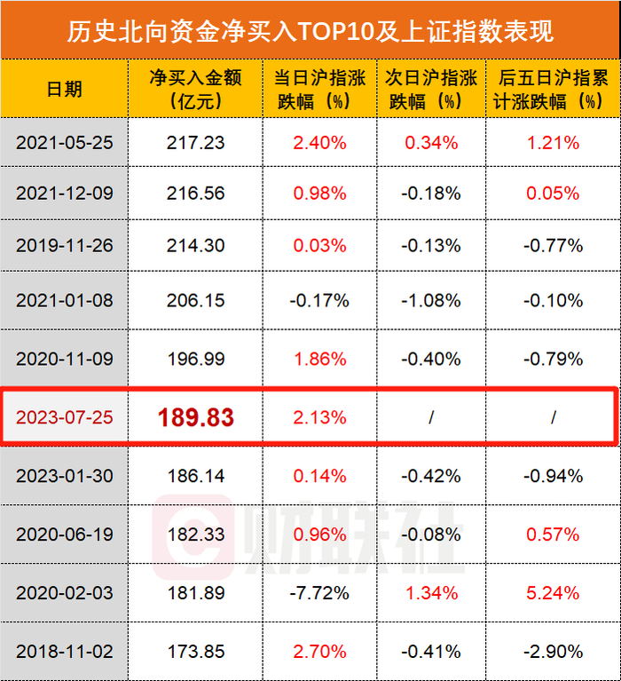 A股的大涨行情也吸引不少外资流入,北向资金疯狂净买入189.83亿元,单日净买入额创年内新高,这一金额位居A股史上第六。从北向资金单日净买入金额前十的数据来看,北向资金大幅净买入当日,沪指有8次上涨,仅有2次下跌,后5个交易日,沪指累计涨幅为正的次数有4次。