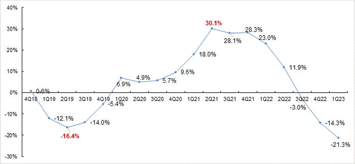 当前半导体正处于萧条周期。如下图所示。按销售额同比增长率的正负判断,本轮周期从2020年一季度进入上行周期,经过2021年的极度繁荣后,于2022年三季度进入下行周期。迄今整个周期已持续3.5年,其中上行10个季度,下行4个季度。按销售额同比增长率的曲线判断,本轮周期从2019年二季度开始上行,2021年二季度达到波峰;之后进入下行周期。迄今整个周期已持续4年多,其中上行9个季度,下行8个季度。有专家预测,当前或已达下行周期底部附近,有望回升。