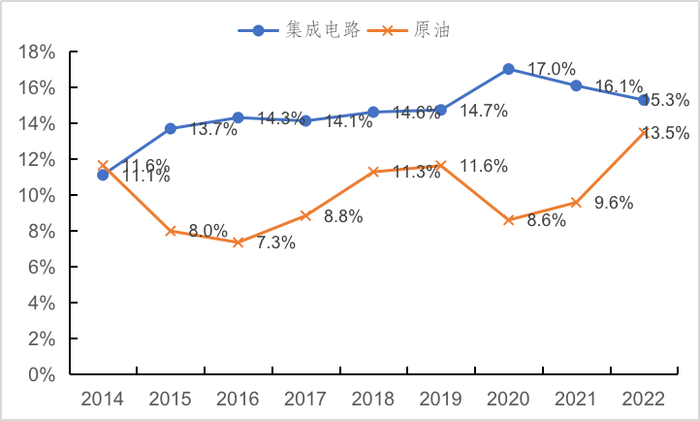 在很多人的印象中,石油、铁矿石和粮食是国际贸易的大宗商品。我国是世界最大的原油进口国,但其进口额远不及集成电路。根据海关总署数据,2015年我国(大陆地区,下同)集成电路进口额超过原油,成为最大进口商品,并持续至今;2018年集成电路进口额超过2万亿元,并持续至今;2022年进口额高达2.77万亿元,占进口总额的15.3%。如下图所示。