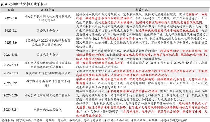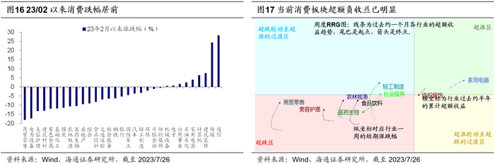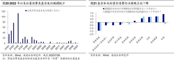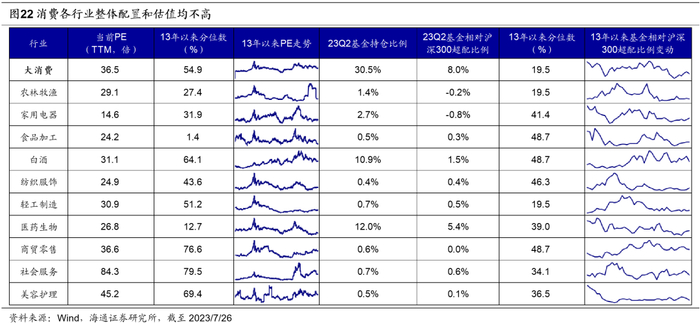 公募消费持仓已大幅回落,后续仓位存在回补的空间。公募基金持仓方面,前期公募基金消费仓位下降较多,公募基金相对沪深300超配消费行业比例已大幅回落,23Q2商贸零售基金相对沪深300超配比例较21Q2下降1.4个百分点,食品加工下降0.5个百分点,美容护理下降0.5个百分点,轻工制造下降0.4个百分点。基金发行方面,新发行消费主题基金热度也有所降温,今年1-7月公募发行消费类基金规模仅24.7亿元。外资持仓方面,北向资金消费超配比例也有所回落,23Q2北向资金持商贸零售相对沪深300超配比例较21Q2下降1.4个百分点,农林牧渔下降0.4个百分点,白酒下降0.3个百分点。因此,当前内外资仓位均回落至低位,未来存在加仓空间。