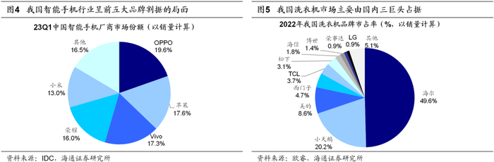 从竞争格局看,成熟期消费行业集中度较高,形成少数龙头割据的局面。我国白电行业经过多年发展,行业结构相对稳定,比如洗衣机行业主要由海尔、小天鹅、美的等国内龙头公司占据大部分市场份额,根据欧睿统计,2022年我国洗衣机CR5/CR2分别为86.8%/69.8%。智能手机行业同样集中度较高,根据IDC数据,23Q1我国智能手机CR5/CR2分别为83.5%/37.2%,龙头厂商占据了大部分市场份额。