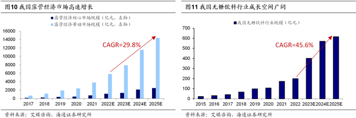 从市场空间看,萌芽期消费行业市场需求初步显现,后续增长潜力巨大。近年来露营作为一项新型运动逐渐进入大众视野,市场规模迅速增长,根据艾媒咨询,预计2022年我国露营经济核心市场规模达1134.7亿元,2025年将达2483.2亿元,未来3年复合增速达29.8%;无糖饮料作为消费观念升级的代表品类也具有广阔成长空间,根据艾媒咨询,2022年我国无糖饮料市场规模为199.6亿元,预计2025年将增至615.6亿元,3年复合增速45.6%。