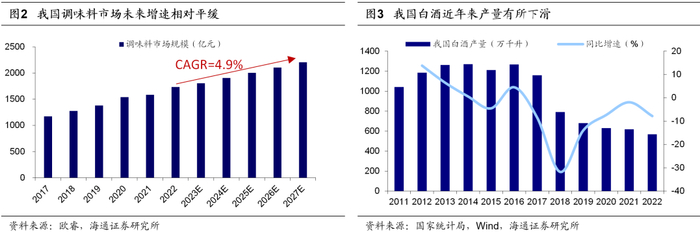从市场空间看,成熟期的消费行业需求已经进入稳态,未来增速相对平缓。以调味料为例,根据欧睿统计,2022年我国调味料市场规模达1734.5亿元,2027年有望扩张至2206.5亿元,未来5年复合增速仅4.9%;不仅如此,部分成熟行业在市场空间触顶后已经进入下滑通道,例如我国白酒近年来产量逐渐下滑,根据国家统计局,2022年我国白酒产量仅569.2万千升,较2017年下降约51%。