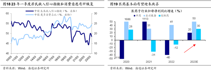短期而言,政策发力和经济复苏有望带动消费基本面预期改善,从而推动估值修复。7月政治局会议将扩内需和促消费放在更重要的位置,后续政策有望陆续落地,从而提振市场对消费基本面的信心。政治局会议提出“要积极扩大国内需求,发挥消费拉动经济增长的基础性作用,通过增加居民收入扩大消费,通过终端需求带动有效供给,把实施扩大内需战略同深化供给侧结构性改革有机结合起来”、“要提振汽车、电子产品、家居等大宗消费,推动体育休闲、文化旅游等服务消费”。政策发力背景下经济和消费有望更好复苏,我们预计今年社零总额增速有望达8-9%,22-23年两年平均增速为4-5%,疫情前社零总额增速在9-10%左右,未来改善的空间较大。社零向好能够带动A股消费基本面改善,消费盈利增速有望提升,其中医药和基本消费部分子行业的盈利有望实现较快增长,结合海通行业分析师和Wind一致预测,我们预计23年医药板块中中药归母净利增速为20%、医疗服务为50%、创新药为30.0%,基本消费中食品加工为30%。随着消费基本面预期改善,市场信心有望逐步修复,进而推动消费板块估值回升。