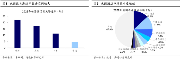 从竞争格局看,成长期消费行业各公司尚未形成绝对优势,市场集中度相对较低。以酒店行业为例,根据欧睿数据,2022年我国酒店行业CR5/CR2分别为40.7%/24.8%,同期美国酒店行业CR5/CR2为62.3%/41.8%,相比之下我国酒店行业集中度仍有较大提升空间;职业教育行业同样处于高速发展期,细分赛道众多,因此竞争格局相对分散,据粉笔招股说明书显示,2021年我国职业考培行业CR5仅22.1%。