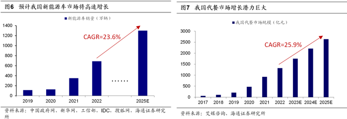从市场空间看,成长期消费行业市场规模仍处于快速扩张阶段,需求增长空间较大。例如近年来我国新能源汽车销量爆发式增长,根据中汽协,2022年我国新能源汽车销售689万辆,同比增长93.4%,根据搜狐网援引IDC预测,2025年我国新能源车销量将达1300万辆,3年复合增速23.6%;代餐食品行业同样处于高速增长期,根据艾媒咨询,2022年我国代餐食品市场达1322亿元,预计2025年将达2639亿元,3年复合增速25.9%。