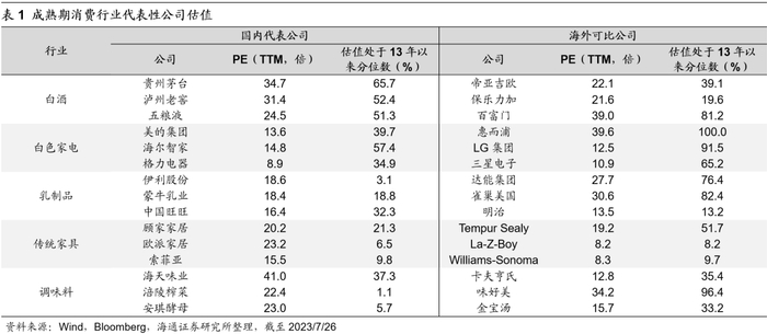 ②成熟期消费品估值已降至历史低位,成长期消费品估值略高于海外但估值盈利匹配度优,萌芽期消费品相较海外估值偏高。