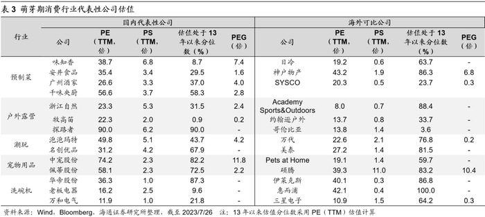 萌芽期消费行业尚处发展早期,成长空间广阔,相较海外可比公司估值偏高。根据前文,萌芽期消费行业增长潜力巨大,但竞争格局分散,部分代表性公司盈利尚不稳定,因此同样适合采用PE、PS以及PEG估值法进行综合比较。在萌芽期行业中,我们选取预制菜、户外露营、宠物用品三个代表性行业的代表性公司开展分析,具体见下文: