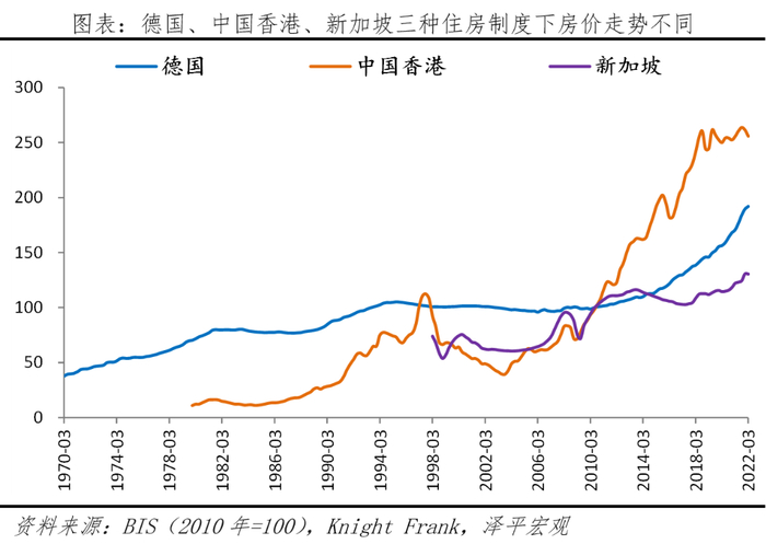 4)住房制度影响的供求格局。住房制度是一国房地产市场导向,一个合适的住房制度能使房价长期稳定、支持实体经济发展,一个不合适的住房制度可能引发房价暴涨暴跌、削弱甚至掏空实体经济。德国房价之所以长期稳定,关键在于其居住导向的住房制度设计,三大支柱分别为:中性稳健的货币政策与住房金融体系,鼓励居民长期持有住房、打击投机的税收制度,保护租户权益、鼓励长期租房的租赁制度。新加坡目前形成以组屋为主、私宅为辅的二元化供应体系,供给结构呈现“廉租房-廉价房-改善型组屋-私宅”的阶梯化分布,住房自有率超过90%,基本实现居者有其屋。中国香港住房制度则不是一个合适的制度,一方面居民居住空间狭小、房价暴涨暴跌,另一方面大量土地未得到充分利用、土地开发率较低。
