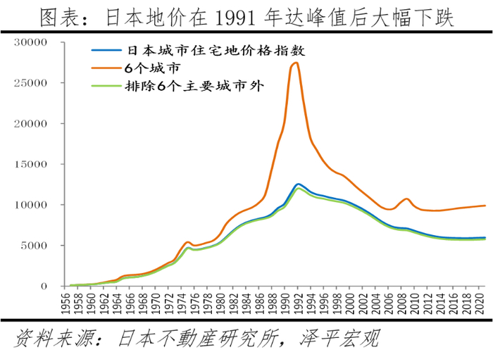 日本地价在泡沫破灭前36年上涨82倍,六个核心城市涨幅更是高达210倍。在1991年房地产泡沫破灭前,日本地价除1975年调整外保持持续上涨,1955-1991年上涨82倍,超过该时期55倍的名义GDP涨幅;其中,六个核心城市地价上涨210倍,非核心城市上涨78倍。分阶段看,1955-1974年日本东京区部、横滨、名古屋、京都、大阪、神户等六个核心城市地价上涨40.6倍、年均21.7%,其他城市上涨29.6倍、年均19.7%,同期名义GDP上涨15倍、年均15.7%。1975-1991年六个核心城市地价上涨4.5倍、年均11.2%,其他城市上涨1.7倍、年均6.4%,同期名义GDP上涨2.2倍、年均7.5%。
