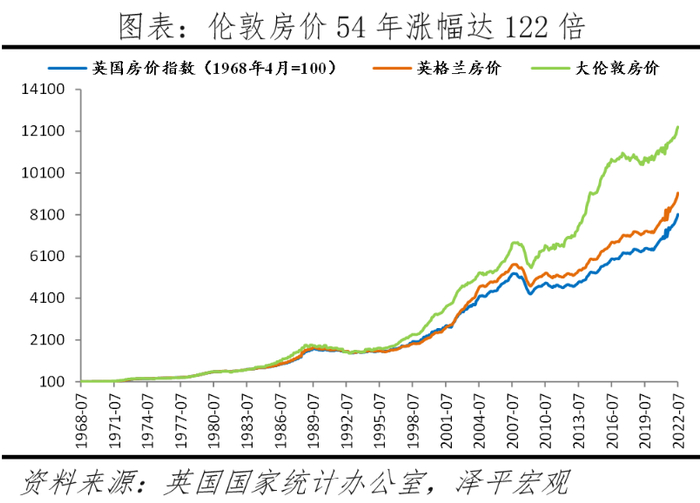 近54年大伦敦地区房价涨幅达122倍,远超英国、英格兰地区房价平均涨幅(80、90倍),和英国名义GDP涨幅(54倍)。根据英国国家统计办公室(ONS)数据,在英国,1968年-2022年7月,大伦敦地区房价从0.44万英镑/套上涨至54万英镑/套,英格兰地区从0.34万英镑/套上涨至31.2万英镑/套,全国从0.36万英镑/套上涨至29.2万英镑/套,伦敦地区房价涨幅达122倍,高于全国的80倍和英格兰地区的90倍。而同期(1967-2021年)英国名义GDP上涨53.6倍、年均增长7.7%,房价涨幅明显跑赢名义GDP增长。