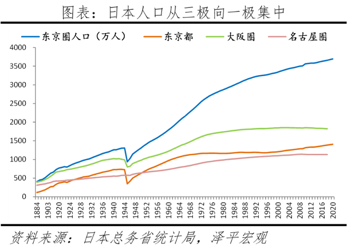 日本人口流动分为两个阶段:在1974年前,全国人口基本持续向东京圈、大阪圈、名古屋圈三极集聚。1884-1973年,除战争影响外,东京圈人口406万人增至2607万人,占比从10.8%增至23.9%;大阪圈人口从392万人增至1636万人,占比从10.5%增至15.0%;名古屋圈人口从311万人增至918万人,占比从8.3%增至8.4%。之后则转为向东京圈一极集中,而名古屋圈人口流入流出基本平衡、大阪圈长期净流出;到2016年,东京圈、大阪圈、名古屋圈人口分别为3629、1831、1134万,占比分别为28.6%、14.4%、8.9%,该时期大阪圈和名古屋圈人口增长主要源于自然增长。东京都人口在1970-1997年人口增长停滞,主要在于东京都区产业转移、人口外迁,但东京都非都区、东京圈三县人口显著增长。