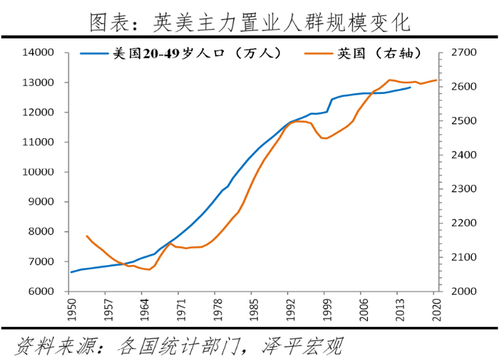 二是人口结构变化影响房价。20-50岁主力置业人群、家庭户规模等人口结构变化,将引致住房需求变化。在家庭户规模方面,由于结婚年龄推迟、不婚率和离婚率提高、低生育率、寿命延长、人口老龄化、人口流动等,导致全球家庭户规模呈小型化趋势,这增加了一定的住房需求。1960-2015年,美国家庭户规模从3.33人降至2.54人,日本从4.14人降至2.39人;此外,1980-2015年,韩国从4.78人降至2.73人。在主力置业人群方面,美国20-49岁人口规模尚在持续增长,日本、韩国、英国分别已在1996、2004、2011年见顶,主力购房人群的规模变化对房地产市场具有非常显著的影响。