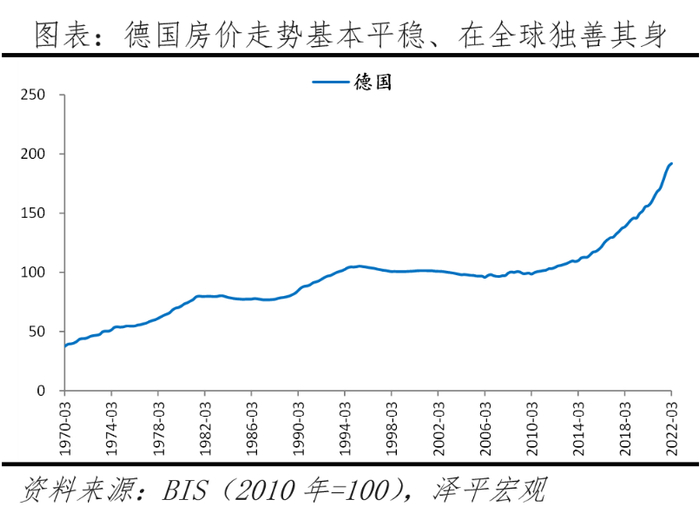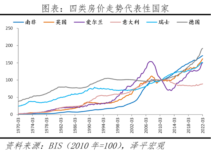 四是房价走势基本平稳、涨幅总体较小的经济体,只有德国1个。1970年以来德国房价有三次比较大的上涨周期:1971-1981年累计上涨近1.8倍,1987-1994年累计上涨35.1%,2009-2022年Q1累计上涨91.5%;而在任何一个下行周期中累计下跌未曾超过10%。