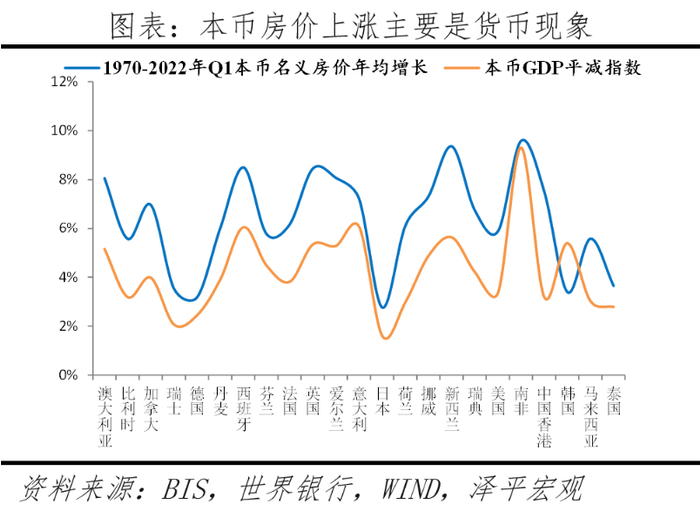3)货币供应带来的货币幻觉。从国际经验看,在经济发展过程中,绝大部分国家均存在不同程度的货币超发,从而引起资产价格变化。一般而言,广义货币供应增速高则通胀高。1970-2022Q1年,23个经济体年均GDP平减指数平均数为4.3%、中位数为4.0%,不仅在绝对水平上与23个经济体房价年均增长的平均数6.3%较为接近,而且波动较为一致。比如,1970-2022年Q1,南非广义货币增长598倍,在货币大幅超发下南非名义GDP增长461.9倍,但实际GDP仅增长3.5倍,房价上涨115.5倍;美国广义货币增长26.3倍,名义GDP增长20.8倍,实际GDP上涨2.9倍,房价上涨18.5倍。但是,货币超发易滋生房地产等资产价格泡沫,极端情况下甚至可能引发经济危机,比如1990年代日本房地产泡沫和2007年美国次贷危机。