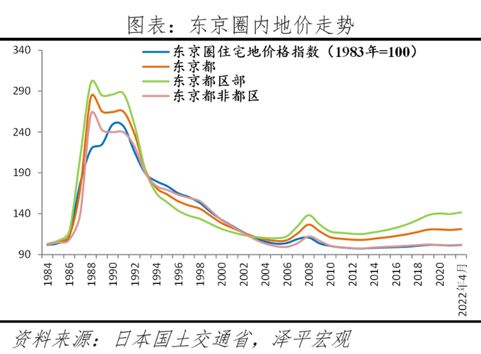 1990年代初房地产泡沫破灭后,东京圈地价大幅下跌至2005年,2006-2008年开始回升,但受全球金融危机影响于2009年开始再次调整,2014年开始再次回升。至2022年4月,东京圈、大阪圈、名古屋圈、地方地价仅分别是峰值的40.7%、27.7%、59.0%、56.8%。大阪圈地价之所以调整幅度最为惨烈,是因为其在泡沫破灭前上涨幅度最大、又缺乏人口支撑。