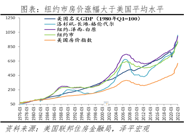 近47年纽约市房价上涨超11倍,高于美国平均水平,但低于纽约市周边及洛杉矶地区房价涨幅。根据美国联邦住房金融局(FHFA)数据,1975-2022年Q1,美国、纽约市、纽约-泽西-白原分区(纽约都会区分区之一)(1976-2022年Q1)、洛杉矶-长滩-格伦代尔分区(洛杉矶都会区分区之一)房价分别上涨10.3倍、11.9倍、15.1倍、25.9倍,年均增速分别为5.3%、5.6%、6.2%、7.2%。纽约-泽西-白原分区房价涨幅虽不及洛杉矶-长滩-格伦代尔分区,但仍显著高于美国平均水平。此外,该时期美国名义GDP上涨15.6倍、年均增长6.2%,M2增长22.5倍、年均增长6.9%。这意味着,纽约市房价跑输同时期美国名义GDP和M2,而洛杉矶-长滩-格伦代尔分区跑赢同时期美国名义GDP和M2。
