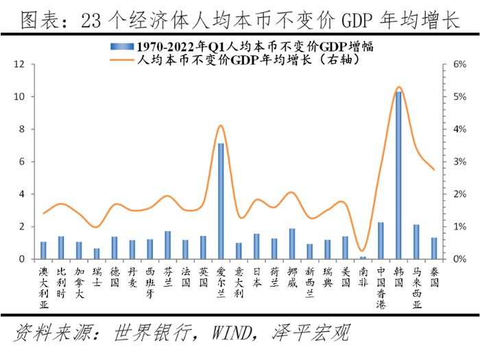 1)经济增长带来的收入效应。不变价GDP增长反映剔除价格后的真实经济增长,人均本币不变价GDP增长意味着居民实际购买力提高、增加房产需求。1970-2022年Q1,23个经济体本币不变价年均增长的平均数为2.8%、中位数为2.3%,人均本币不变价年均增速的平均数为2.0%、中位数为1.7%(部分经济体数据计算从有房价数据时开始,西班牙、中国香港、韩国、马来西亚、泰国分别从1971、1979、1975、1988、1991年开始)。其中,韩国人均本币不变价GDP年均增长高达5.3%,爱尔兰、中国香港、马来西亚、泰国年均增长均在2.5%以上,其他经济体多在2%以下,南非仅有0.3%。