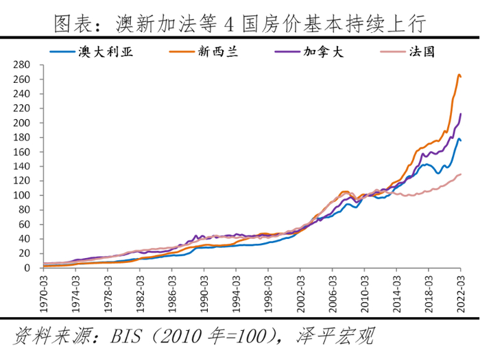 一是房价基本持续上行、期间调整幅度小的经济体,有澳大利亚、新西兰、加拿大、法国等4个。1970年以来上述4国任何一次下行周期中累计下跌幅度均未超过9%。其中,澳大利亚、新西兰、加拿大等3国未曾出现连续两年下跌的情况;法国在1992-1995年、2008-2009年、2011-2015年三次明显调整,但三次累计跌幅均未曾超过7%。