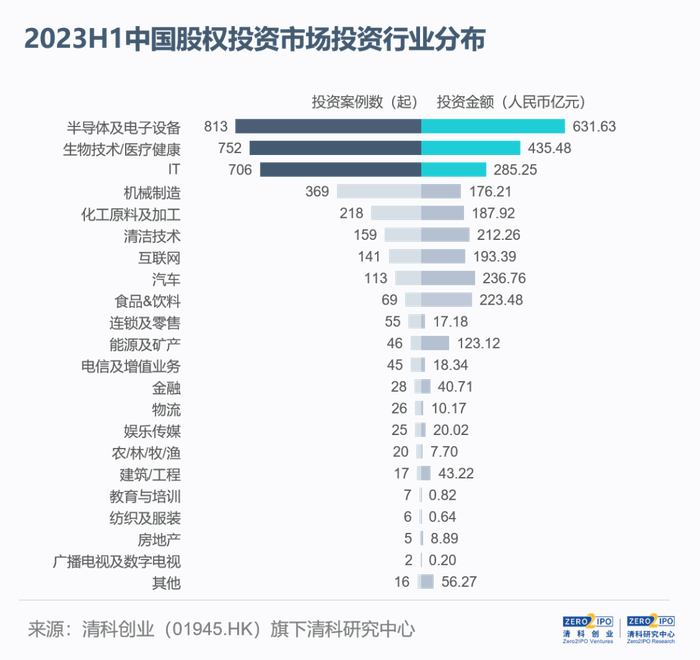 从行业分布来看,2023年上半年投资案例持续集中于半导体及电子设备、生物技术/医疗健康与IT行业,三大领域共发生投资案例数2,271起,占比62.4%。