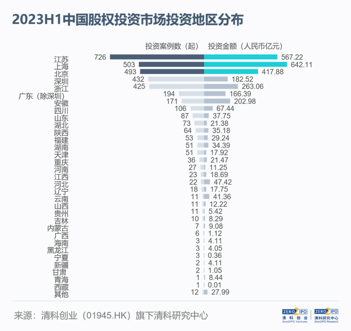 从投资地域来看,2023年上半年中国股权投资市场主要热点地区仍为江苏、上海、北京、深圳及浙江,五地合计贡献了市场70.9%的案例数及70.8%的投资金额,较2022年上半年增加0.5个、3.6个百分点。