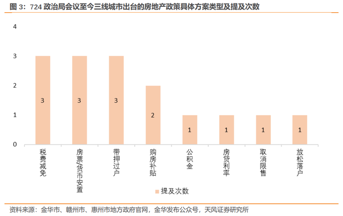 三线城市:724政治局会议至今,有3个三线城市(金华、赣州、惠州)出台了放松性房地产政策,具体方案包括税费减免、房票或货币安置、带押过户等,被提及次数较多。