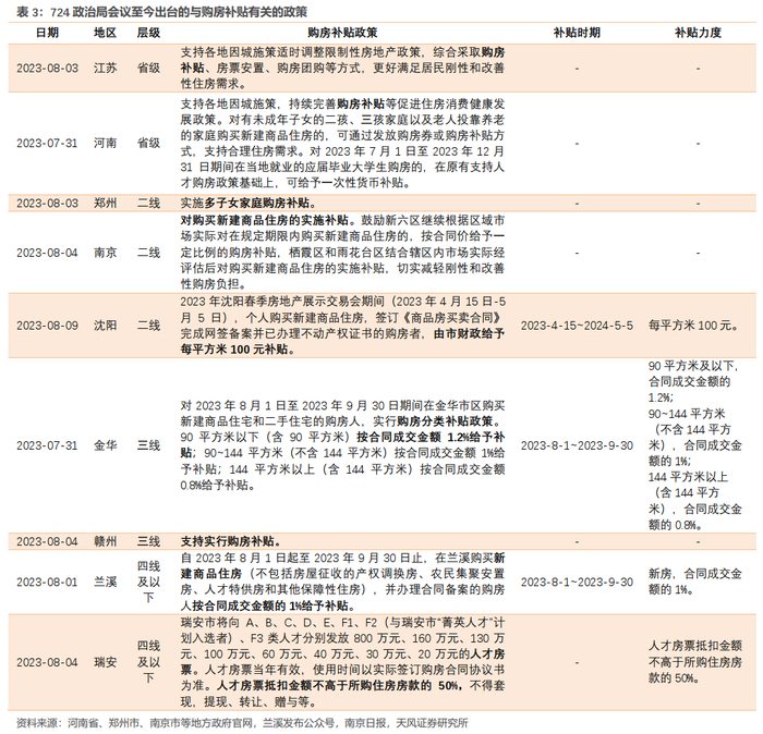 发放购房补贴、放松公积金使用条件是目前主要的调整方案。尤其是购房补贴,比如浙江金华对今年8-9月购房的居民根据面积不同发放合同成交金额0.8%-1.2%的补贴,浙江兰溪对今年8-9月购买新房的居民发放合同成交金额1%的补贴。不过,除了金华、兰溪、沈阳、瑞安外,其余地区尚未明确购房补贴的具体金额,政策效果仍有待进一步观察。
