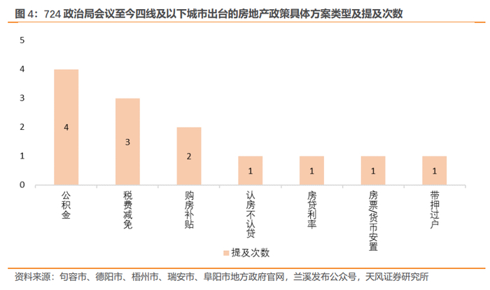 二线城市:地产政策的调整较为积极。724政治局会议以来,共有六个城市出台了7项房地产相关的政策,分别是重庆、郑州(2项)、南京、合肥、沈阳、西宁,且均涉及具体的方案。其中被提及次数较多的方案,主要是放松公积金使用条件(4次)、购房补贴(3次)。