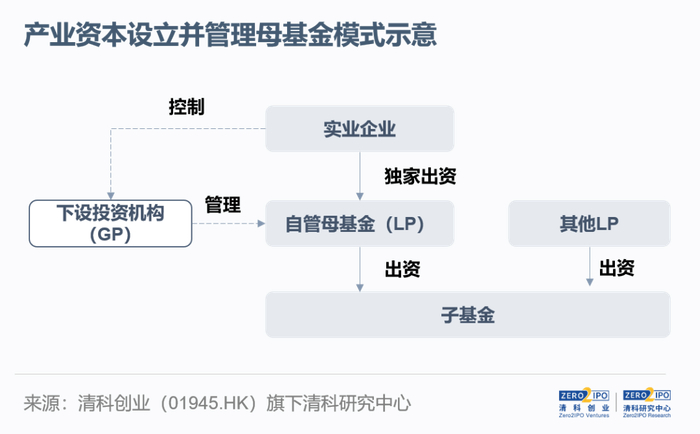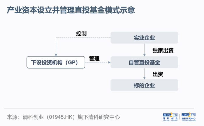 随着实业企业参与股权投资经验的累积,其投资运营专业度逐渐提升,运作也更加独立,已与专业投资机构相差无几。此时,部分实业企业将投资职能剥离,成立独立投资机构并由其自主发起设立直投基金或母基金。其中,实业企业作为基石投资者参与基金的设立,同时投资机构自主开展市场化募资。