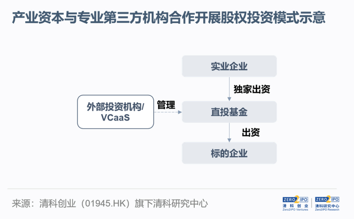 自建投资团队开展股权投资需要投入大量时间与资金成本,同时也面临着一定投资风险,对于多数实业企业来说是一笔不小的支出。产业资本在项目估值、投资谈判等具体事务及环节的经验或技巧不足,加上同业投资时尽调可能遇到阻碍,开展股权投资时面临不小的挑战。此背景下,部分实业企业选择与专业投资机构或是选择“风投即服务”(VCaaS)的服务商合作,独资设立专项基金从事产业投资。借助第三方机构的力量,实业企业得以高效地开展股权投资,实现自身的战略布局。
