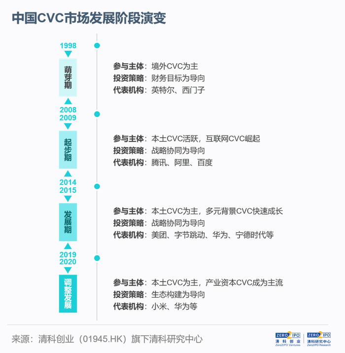 相比于海外市场CVC的发展,中国CVC投资起步较晚,大致可分为四个阶段,其市场格局演变趋势与中国股权投资市场的发展紧密相连。1998-2008年是我国CVC投资的萌芽期,这一时期活跃参与者以境外产业背景企业为主。2009-2014年,中国CVC投资进入起步,以战略协同为目的的CVC投资逐渐增多。2015-2019年,移动互联网行业快速发展,各行各业的优质本土企业纷纷试水股权投资,推动我国CVC投资步入快速发展期2020年至今,我国CVC投资步入调整发展期。随着国家反垄断监管逐渐常态化,互联网企业放缓出资步伐,产业资本则更加关注自身产业链上下游的投资机会。整体来看,生态构建成为CVC投资的侧重点。