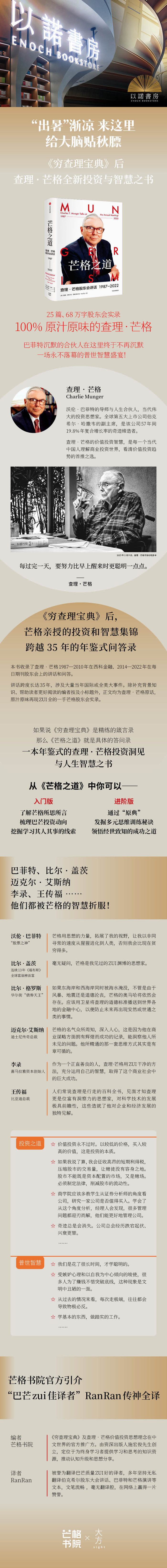《芒格之道》的译者,是被誉为“巴芒最佳译者”的RanRan。熟悉巴芒二人或每年关注股东会信息的人,对RanRan一定不陌生,由他翻译的伯克希尔股东会讲话、巴菲特和芒格演讲等文本,文笔流畅而风趣,毫无翻译腔。