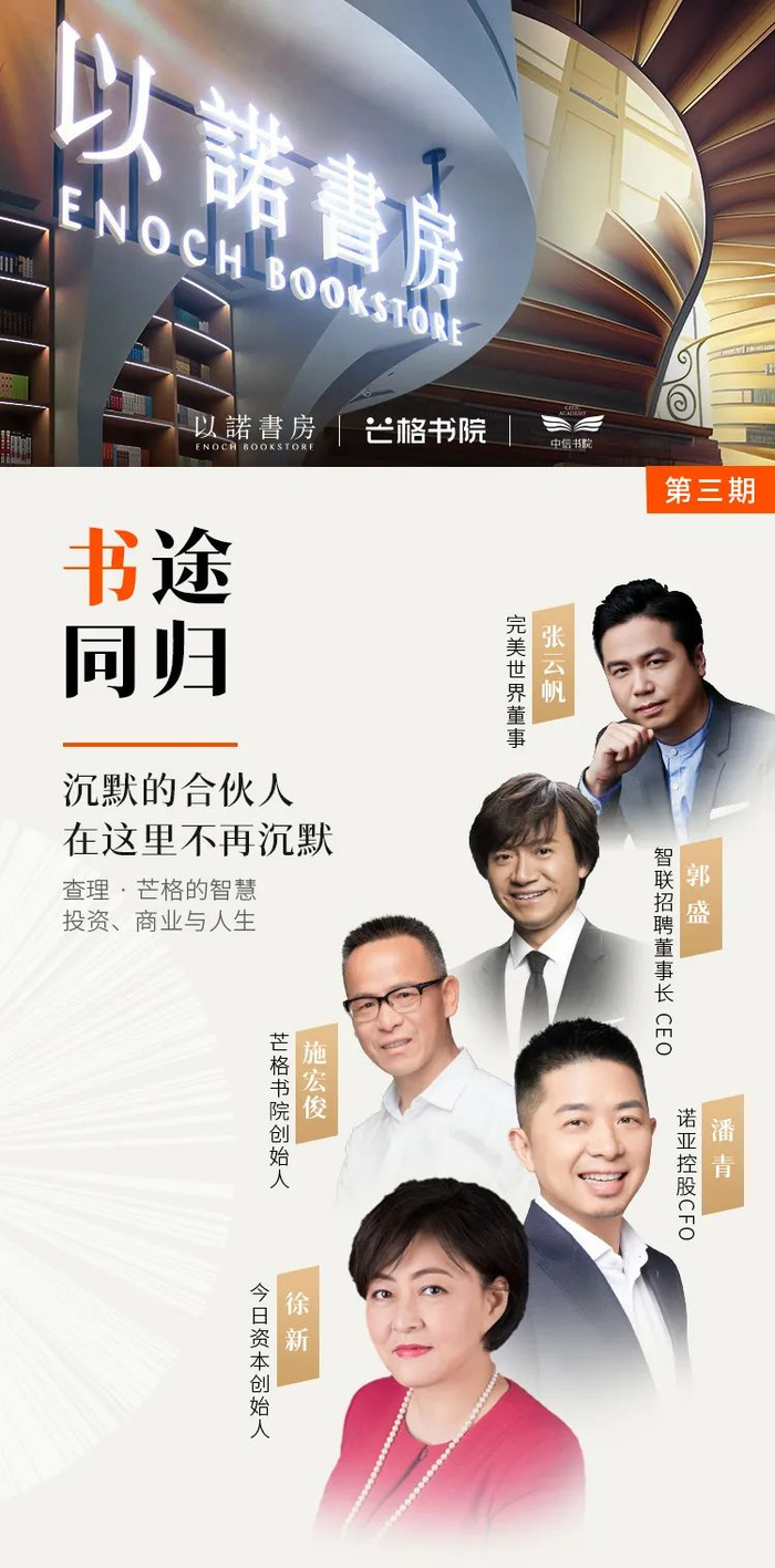 本期以诺书房读书私享会,邀请到今日资本创始人徐新、智联招聘CEO郭盛、完美世界董事张云帆、诺亚控股CFO潘青、芒格书院创始人施宏俊五位嘉宾,共同解读查理·芒格的投资理念、商业思考与人生智慧,将芒格思想与中国实践相结合,为身处变革时代的读者与企业带来一场思想盛宴。
