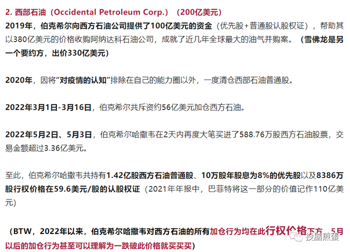 也就是要么已经收购了100%的股份(伯克希尔、内布拉斯加家具城、波仙珠宝、喜诗糖果、飞安等等等等),要么卖家不肯再卖(在伯克希尔能源公司的收购中巴菲特只能1个百分点、1个百分点地增持),要么价格在买入后超过了巴菲特的心理价位,如西方石油: