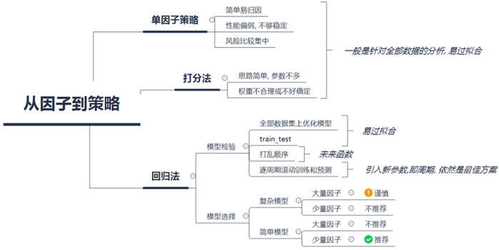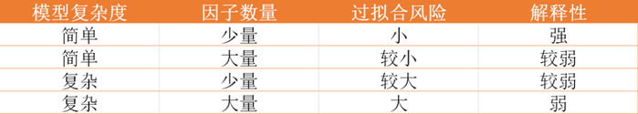 在回归法的模型选择部分,可以根据因子数量和模型复杂度,将回归法的应用分为下图中的四种组合。通常情况下,随着模型复杂度和因子数量的提升,过拟合的风险也会随之增加,同时模型的解释性可能会下降。因此,尽管当前大模型和大数据思维占据主导地位,我们仍然重视简单模型和少量因子的组合,同时谨慎处理复杂组合。通过有效管理多个“小而精”的模型,可以在提高解释性的同时实现出色的绩效。